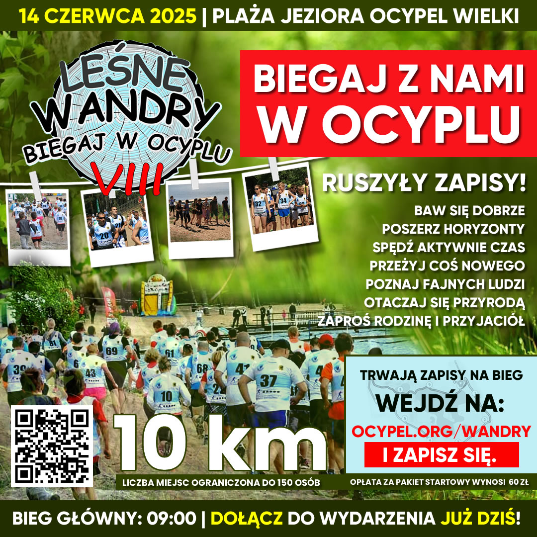 Za nami ósma edycja wyjątkowego wydarzenia – Biegaj w Ocyplu – Leśne Wandry VIII. 14 czerwca 2025 roku spotkaliśmy się w malowniczym Ocyplu, by wspólnie przeżyć sportową przygodę w sercu kociewskich lasów. Wasza obecność, zaangażowanie i energia sprawiły, że tegoroczna impreza na długo pozostanie w naszej pamięci. Ufamy, że również Wy, Wasze rodziny, przyjaciele i sympatycy biegania będziecie ją wspominać z uśmiechem i dumą!